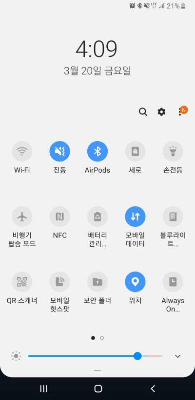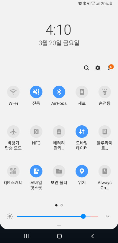 우선 가장 쉽게 할 수 있는 작업은 휴대폰 상태바를 내려 모바일 핫스팟을 활성화하는 작업입니다. 이때는 기존에 설정된 핫스팟이 자동으로 활성됩니다.