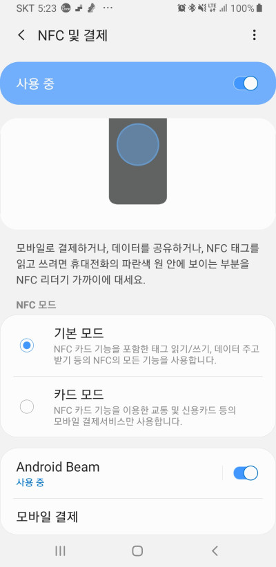 안드로이드 휴대폰은 대부분 NFC 기능을 ON/OFF 할 수 있도록 설계되어 있으며 일반모드 및 카드모드처럼 NFC를 켰더라도 또 다시 내부설정이 가능하게끔 셋팅이 가능합니다.