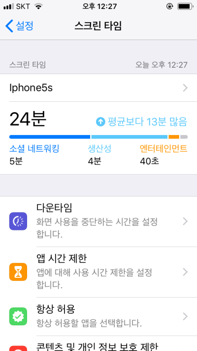 스크린타임을 껐을 때랑 켰을때 상황입니다. 설정을 제대로 하지 않은 상태라 뭐 별거 없네요.