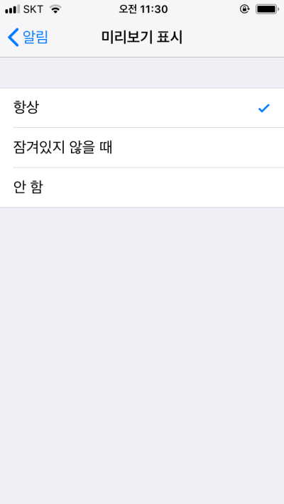 아이폰 설정의 알림으로 이동하여 미리보기 표시를 변경하는식으로 알림을 뜨지 않게 설정할 수 있습니다.
