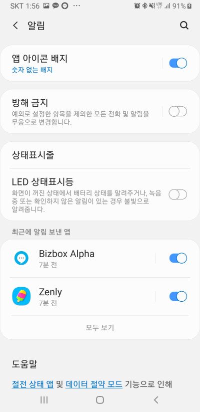 설정에서 알림 메뉴로 이동하여 앱 아이콘 배지를 비활성화하여 알림에 표시가 되지 않게 만들 수 있으며 최근에 알림 보낸 앱 밑에 있는 모두 보기를 누릅니다.