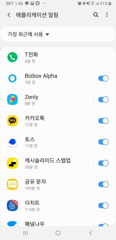 애플리케이션 알림이 나오면 여기서 원하는 앱에 대한 알림을 비활성화함으로서 알림이 뜨지 않게 가리는 것이 가능합니다.