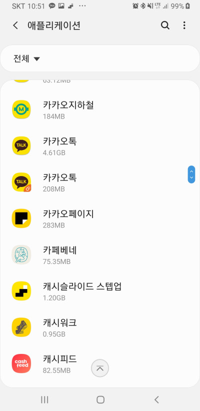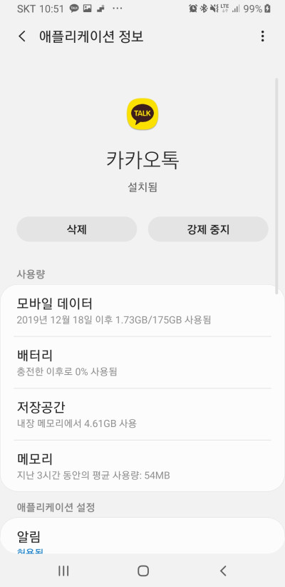 설정의 애플리케이션으로 이동하여 카카오톡을 선택합니다.