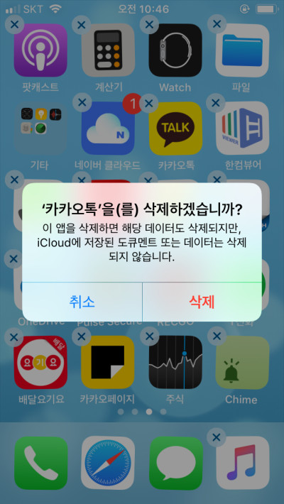 현재 설치된 아이폰 카카오톡을 삭제합니다.