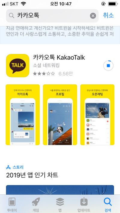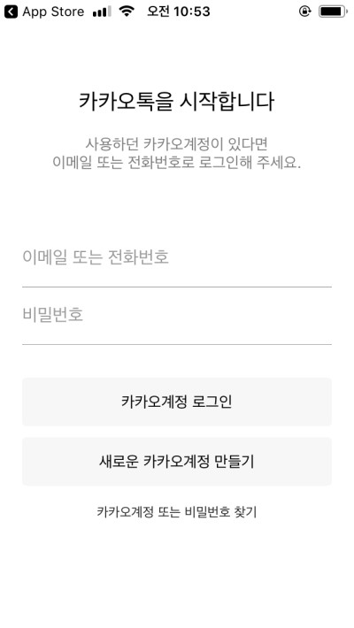 그리고 앱스토어에서 카카오톡을 다시 다운로드 받은 뒤 설치하면 이런식으로 처음화면으로 되돌아가게 됩니다. 물론 위에서 작업한 갤럭시 핸드폰과 동일하게 채팅내역이 모두 사라지게 됩니다.