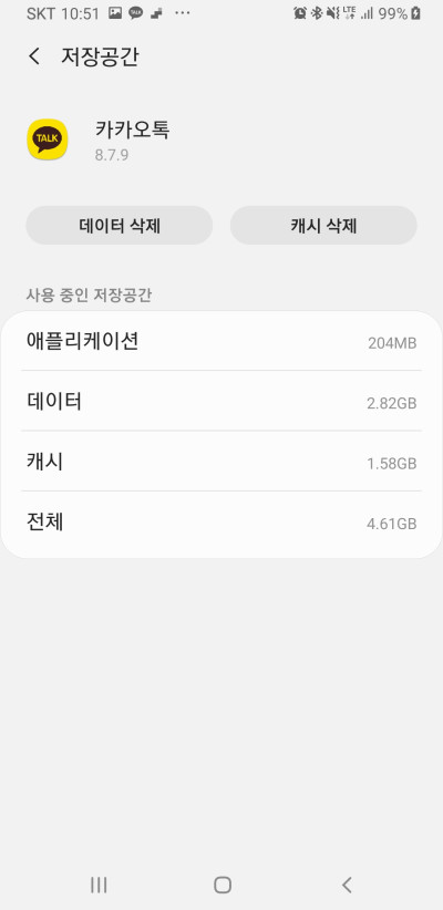 저장공간을 누르고 데이터 삭제 및 캐시삭제를 하고 카카오톡을 다시 실행하면 현재 로그인된 계정이 로그아웃되며 어플(앱) 삭제 없이 다시 설정이 가능합니다. 물론 이 상황에서는 저장된 채팅내역이 모두 삭제되므로 함부로 할 수 있는 작업은 못됩니다.