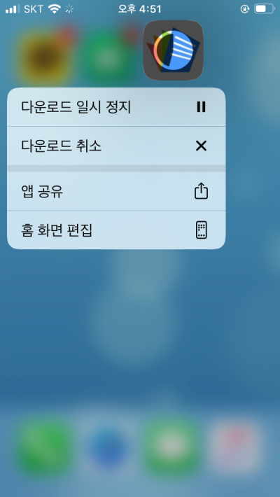 앱 다운로드가 되지 않고 멈춰 있다면 앱스토어에서 밖으로 나와 설치중인 앱을 꾹 눌러봅니다. 그러면 이러한 화면이 나오는데 여기서 다운로드 일시 정지를 누른 뒤 다시 시도해봄으로서 문제 해결의 실마리를 찾을 수 있습니다.
