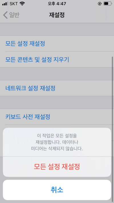 네트워크 재설정을 해도 뭔가 증상이 개선되지 않는 것 같다면 모든 설정 재설정을 해봅니다. 사실 이 이상을 하기에는 데이터 손실의 위험이 있기 때문에 더 이상은 진행하지 않고 여기까지만 진행함으로서 테스트를 해볼 수 있습니다.