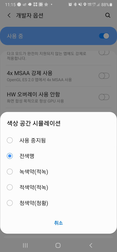 개발자 옵션에서 색상공간 시뮬레이션을 선택합니다.
