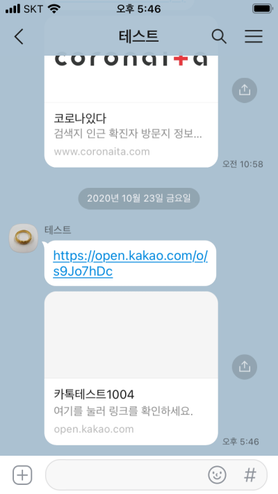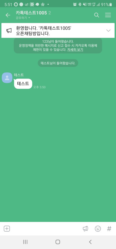 채팅방 이름을 카톡테스트1004로 생성하였습니다. 과연 해당 채팅방에 들어올 수 있을까요?