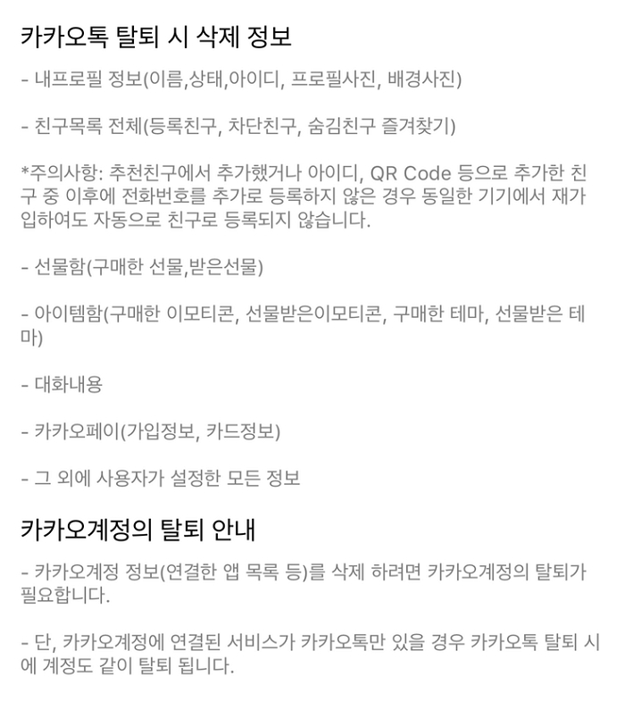 카카오톡 안내에서도 계정 탈퇴를 하면 친구가 삭제된다고 하며 공식적인 3가지 방법 이외에 정보를 모르는 상태에서의 친구추가 부분은 재가입을 해도 복구가 되지 않는다고 설명을 하고 있습니다. 결국 탈퇴를 하지 않고는 수많은 친구를 원클릭에 삭제하는 방법은 없는걸로 아시면 되겠네요.
