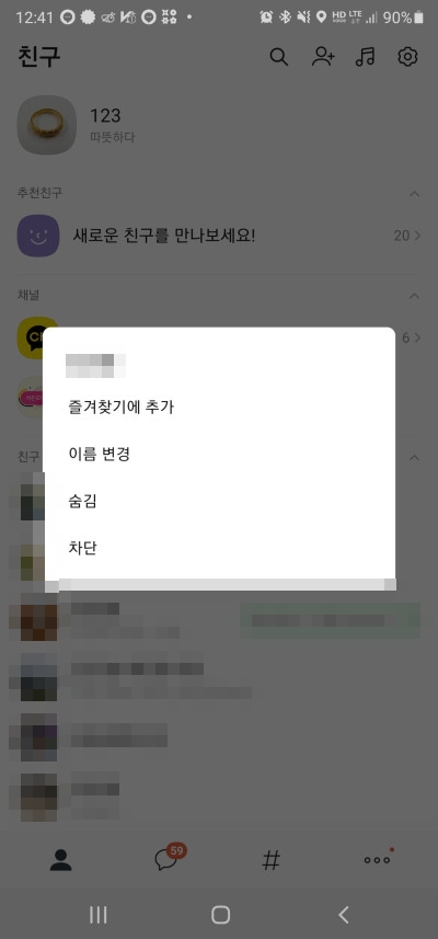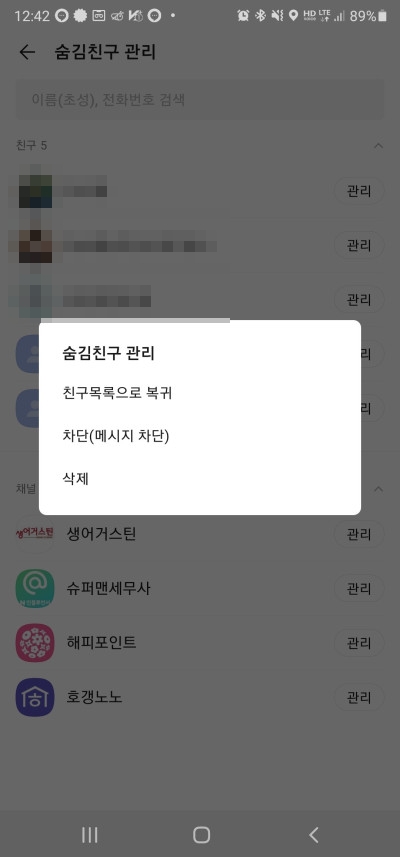 문제는 이렇게 여러 경로로 등록된 친구를 초기화하는 공식적인 방법이 없다는데 있습니다. 일일히 이렇게 친구를 숨기거나 차단한 뒤 관리항목으로 이동하여 삭제를 해야 등록되어 있는 친구가 사라지는거죠.