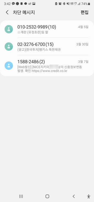 수신 차단을 들어가보면 본인이 차단한 리스트가 나오는데 여기에 있는 사람들 리스트는 저도 누군지 모릅니다. 아마 스팸으로 인해 차단했을 확률이 99%인데 이러한 사람들은 스팸문자를 보내고 번호를 변경하기 때문에 사회적으로 문제가 되고 있습니다. 차단 메시지를 가보면 본인이 차단한 메시지 내역을 볼 수 있는데 문자가 주기적으로 오길래 차단을 했던 문자와 광고문자 및 신용관련 문자입니다. 아마도 인증문자가 오지 않는다면 여기 있을 확률이 높습니다.