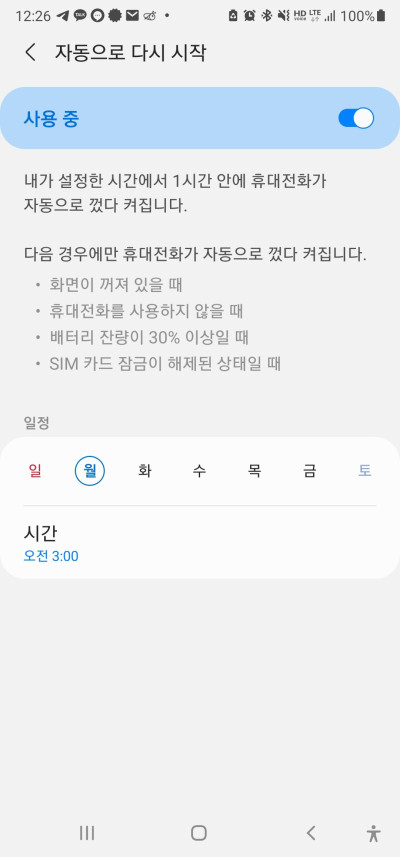 언제부터인지는 모르겠지만 갤럭시 휴대폰 기준 자동 재부팅 설정을 할 수 있도록 옵션이 준비되어 있습니다. 주로 새벽시간대에 설정해놓는데 어떻게 하는지 간단하게 살펴보면 다음과 같습니다.