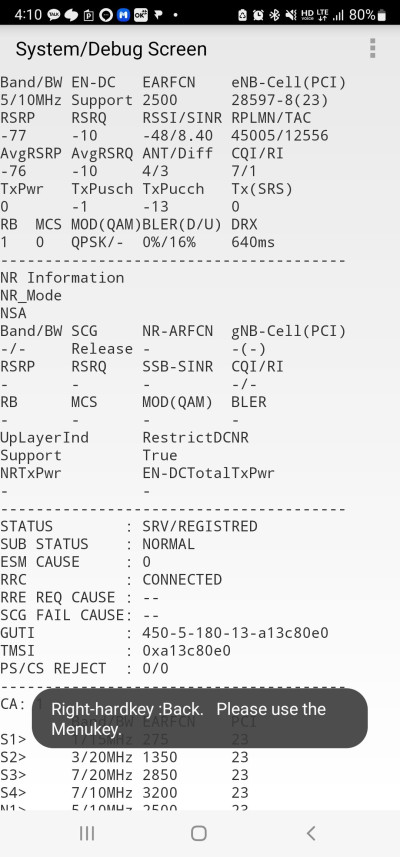 서비스모드로 들어갔는데 상단에 보시면 RSRP가 보이고 밑에 -74라고 써있는 것을 확인할 수 있습니다. 또한 와이파이가 연결되어 있다면 와이파이 연결 상태 역시 확인할 수 있습니다.