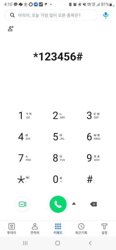 휴대폰 기본 앱에서 *123456#을 누릅니다. 예시를 보여드리기 위해 T전화에 입력하였으며 T전화에서는 각종 서비스 모드로 진입하기 위해 입력을 해도 진행이 되지 않습니다.