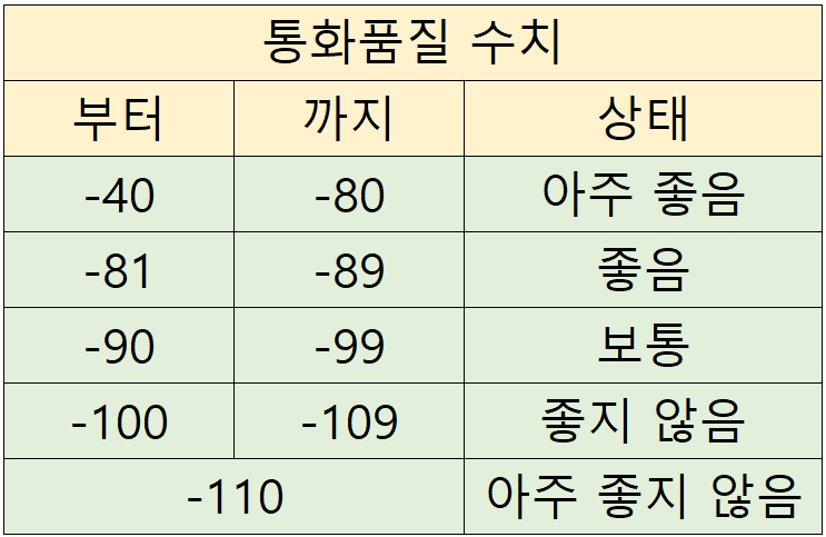 수치는 -40부터 -110 또는 그이상까지 나올 수 있으며 대체적으로 통화에 이상이 없을 경우 -90을 넘기지 않는 편입니다.