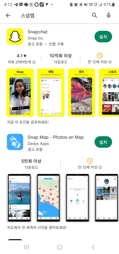 구글 플레이스토어에서 스냅맵을 검색하면 스냅맵이라는 이름의 앱이 두어개 나오긴 하지만 해당 앱은 여기서 언급하는 스냅맵과는 전혀 다른 앱으로서 스냅챗을 다운로드 받고 설치한 뒤 회원가입을 하고 로그인을 진행해야 합니다.
