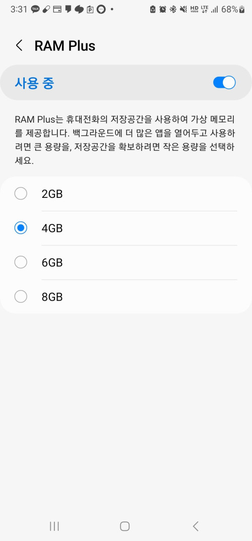 하단에 보면 RAM Plus라고 보이는데 최소 2GB에서 최대 8GB까지 설정이 가능한 것을 알 수 있습니다. 필요하지 않다면 비활성화를 해도 되지만 일단은 8GB로 올려보겠습니다.