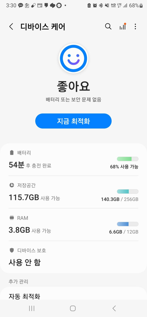 스마트폰 설정에서 배터리 및 디바이스 케어 항목으로 이동하여 램을 보면 3.8GB 사용 가능이라고 적혀 있는데 이곳을 눌러줍니다.