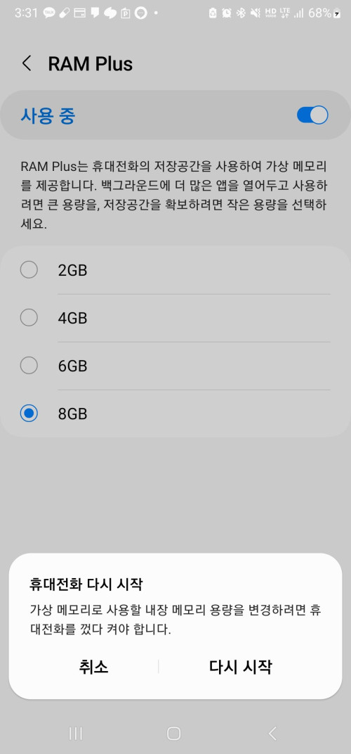 해당 작업 실행시 현재 보유중인 저장공간에서 8GB가 사라진다고 생각하시면 되며 재부팅이 필요한데 재부팅 후 다시 옵션을 확인해보면 Ram Plus 항목이 8GB로 변경되어 있는 것을 알 수 있습니다.