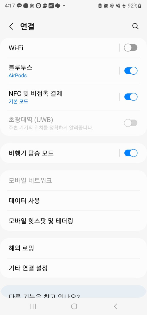 갤럭시 휴대폰 비행기 탑승모드 적용시 블루투스(에어팟 이어폰 등) 및 추가기능 사용 여부