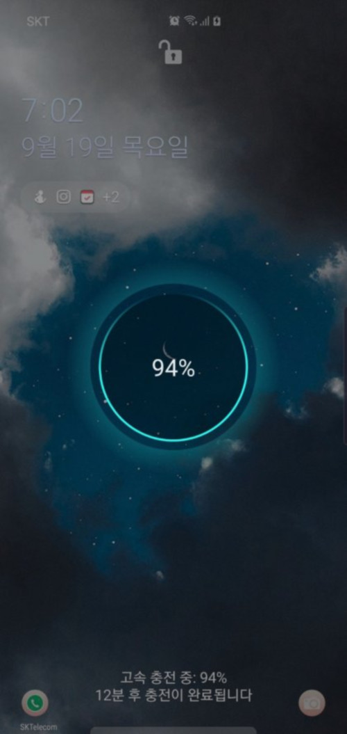 실제로 휴대폰을 충전했을때 발생되는 화면인데요 고속충전까지는 녹색계열의 원형 형태 충전 표시가 나타나며 초고속충전은 하늘색 계열의 원형 충전 표시가 나타납니다.