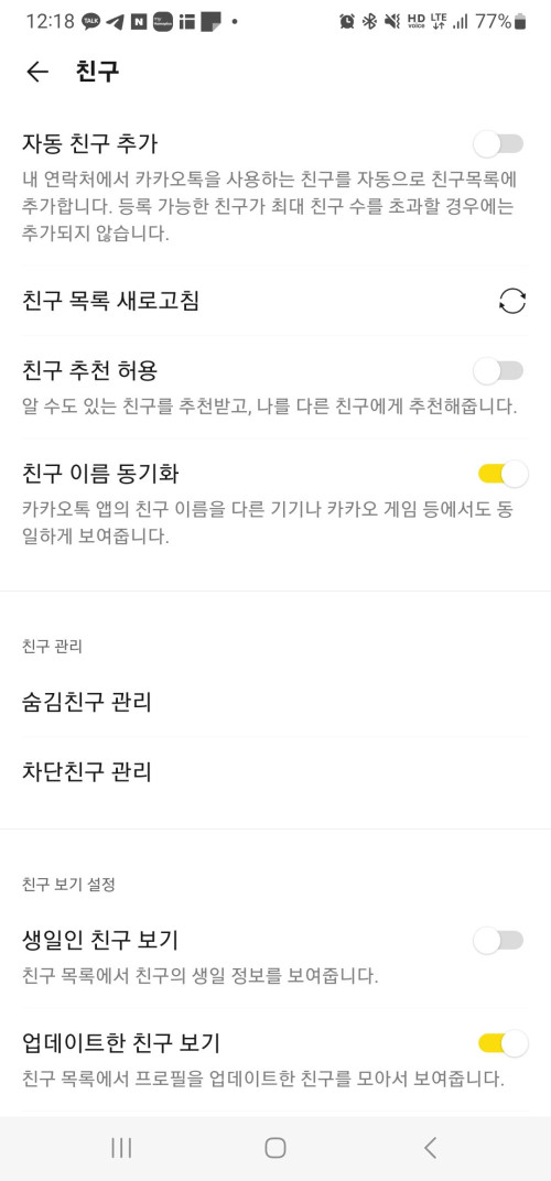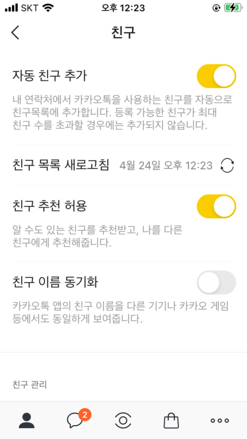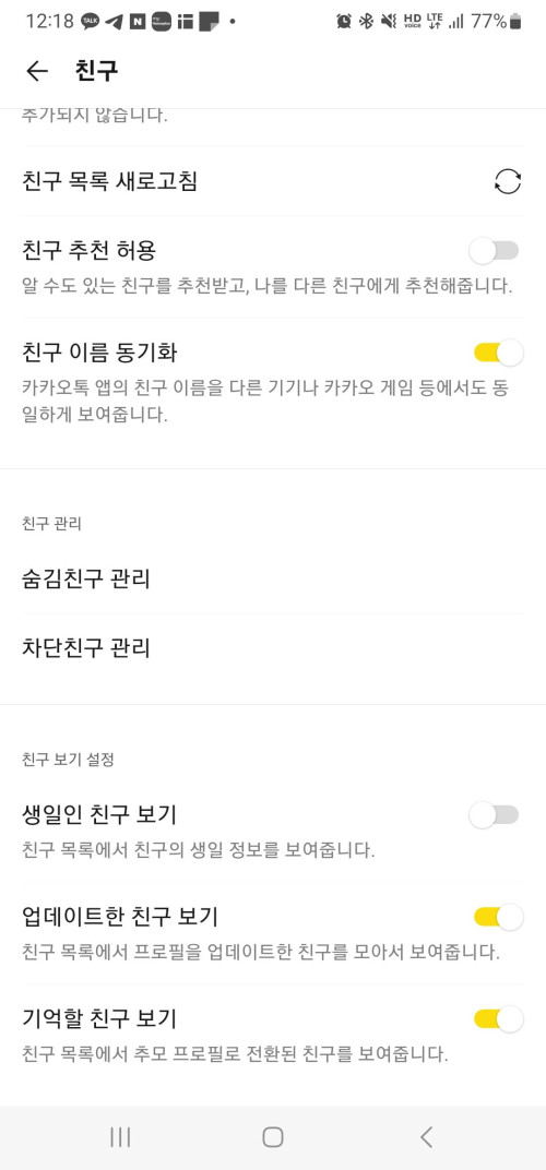 문제는 타인의 정보를 저장하여 추가하고 메세지를 보내는 과정이 상대방은 거부할 수 없도록 되어 있다는 것입니다. 정확하게는 친구등록을 막을 수 있는 옵션이 없어 최초 1회에 한해서는 대응이 불가능하다는 것입니다. 친구 관련 옵션을 확인해봐도 이와 비슷한 옵션은 찾을 수 없습니다.