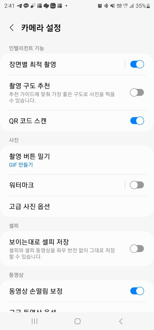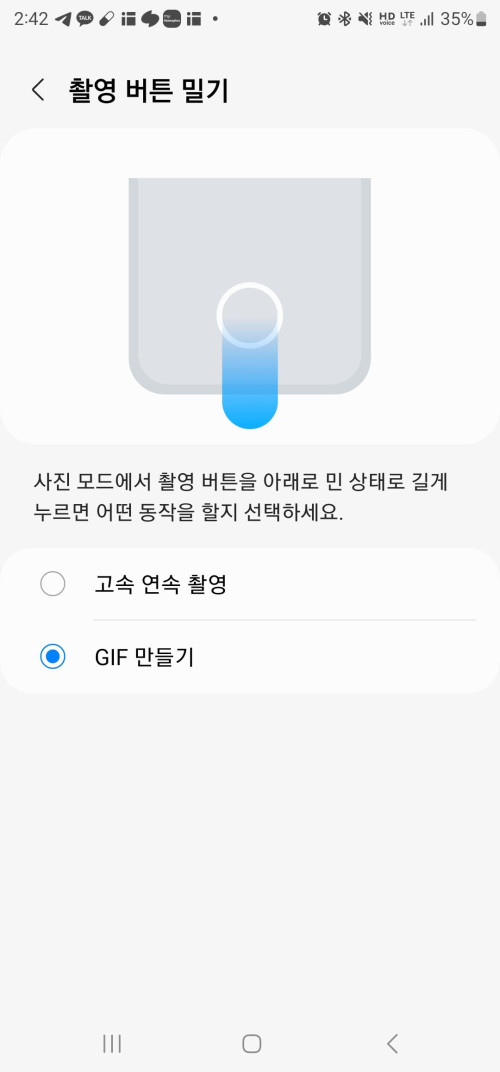 카메라앱에서 좌측 상단 설정 아이콘을 누르고 사진 ▶ 촬영버튼 밀기 항목을 확인하여 GIF 만들기로 설정했는지 확인합니다.