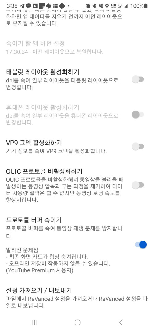 그리고 프로토콜 버퍼 속이기 옵션을 활성화 시켜줍니다. 저는 이미 활성화가 되어 있었습니다. 어쨌든 이후 다시 나와서 유튜브를 실행하게 되면 영상 중간에 무한로딩이 발생하는 일이 사라지게 됩니다.