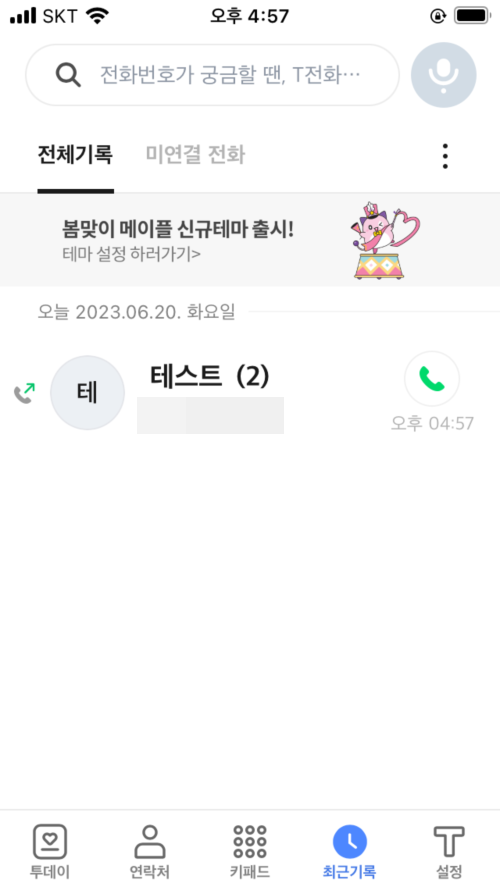 아이폰에서 T전화 앱으로 통화목록을 누르면 다음과 같이 진행됩니다.