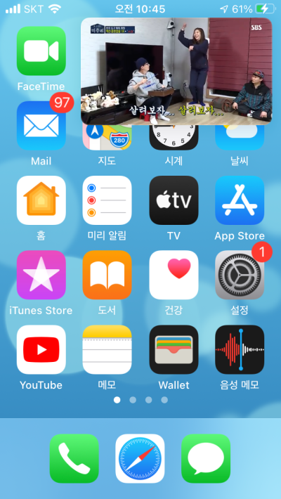 유튜브가 작은 창에 작동하고 있는 모습인데 이 상태로 다른 인터넷을 하거나 밖으로 빠져나와 다른 앱 사용이 가능합니다. 이 방법을 사용하면 아마 다수의 앱을 켜놓아 메모리가 부족해지지 않는 이상 앱 튕김은 나오지 않을거 같습니다.